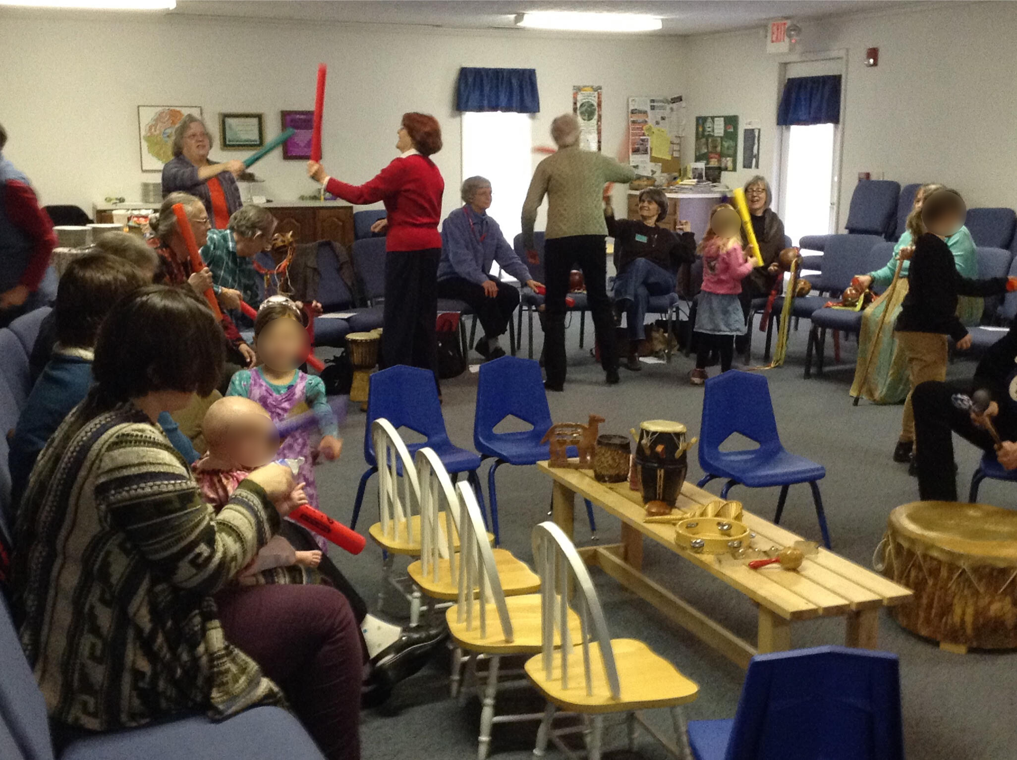 Photo: UUs get ready for an intergenerational drum circle. Photo courtesy of Liz Woedl.